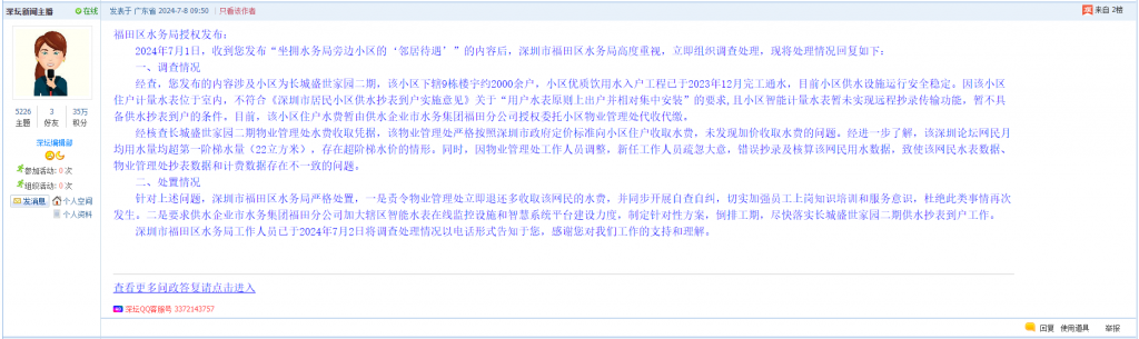 2024年7月1日,收到您发布“坐拥水务局旁边小区的‘邻居待遇’”的内容后,深圳市福田区水务局高度重视,立即组织调查处理,现将处理情况回复如下: