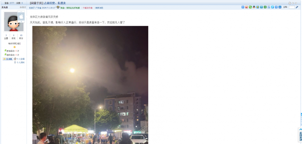 7. 帖文《求政府关注!强烈投诉龙岗宝龙街道卓弘高尔夫雅苑楼下巴*子烧烤乱摆卖扰民的行为!》