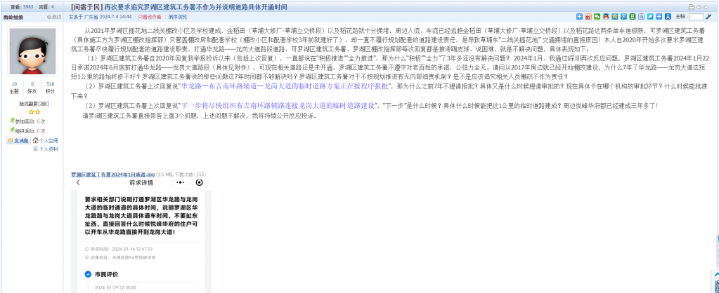 9. 帖文《再次要求追究罗湖区建筑工务署不作为并说明道路具体开通时间》