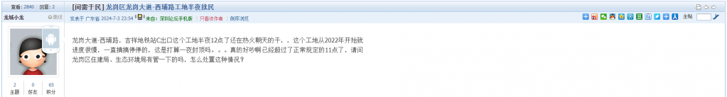 6. 帖文《龙岗区龙岗大道-西埔路工地半夜扰民》