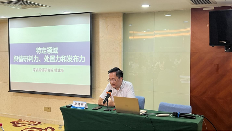 深圳新闻网2024年8月2日讯(记者 蔡雪曼 实习生 谢臻儿)为提高全市特定领域人员舆情工作素养,深化舆情意识和认知,助力营造良好的舆论氛围,7月25日下午,某市直单位举办专题培训班,邀请深圳舆情研究院执行院长黄成禄担任授课老师,围绕《特定领域舆情研判力、处置力和发布力》主题展开授课。