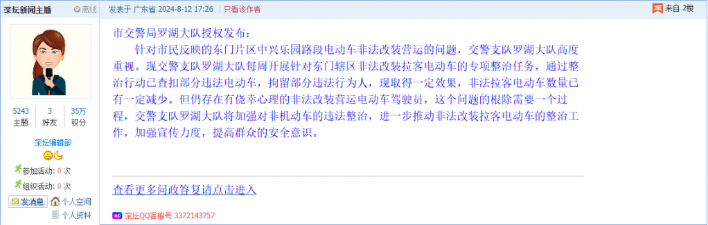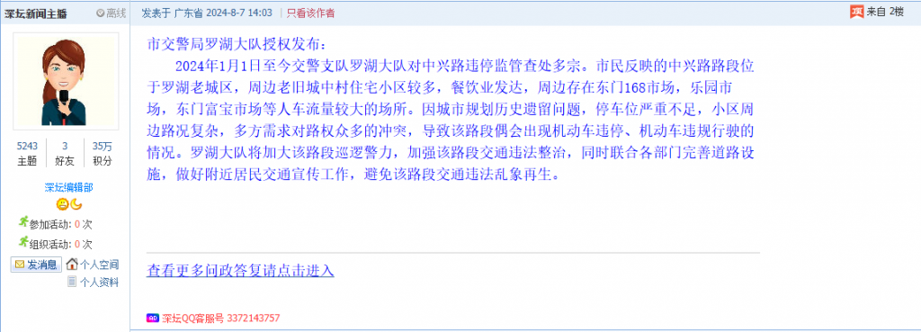 据统计,2024年8月5日-8月11日,网友在深圳论坛发布问政类帖文共38篇,得到相关单位正式回应的帖文数为27篇,罗湖区回应率最高,回复最快的部门是罗湖区莲塘街道办事处、龙岗区布吉街道办事处。
