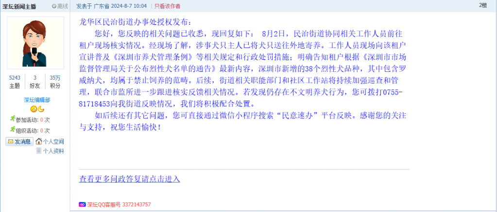 各职能单位如需对网友反映的问题进行回应,可在深圳论坛注册官方账号并通过认证,回帖进行回应。