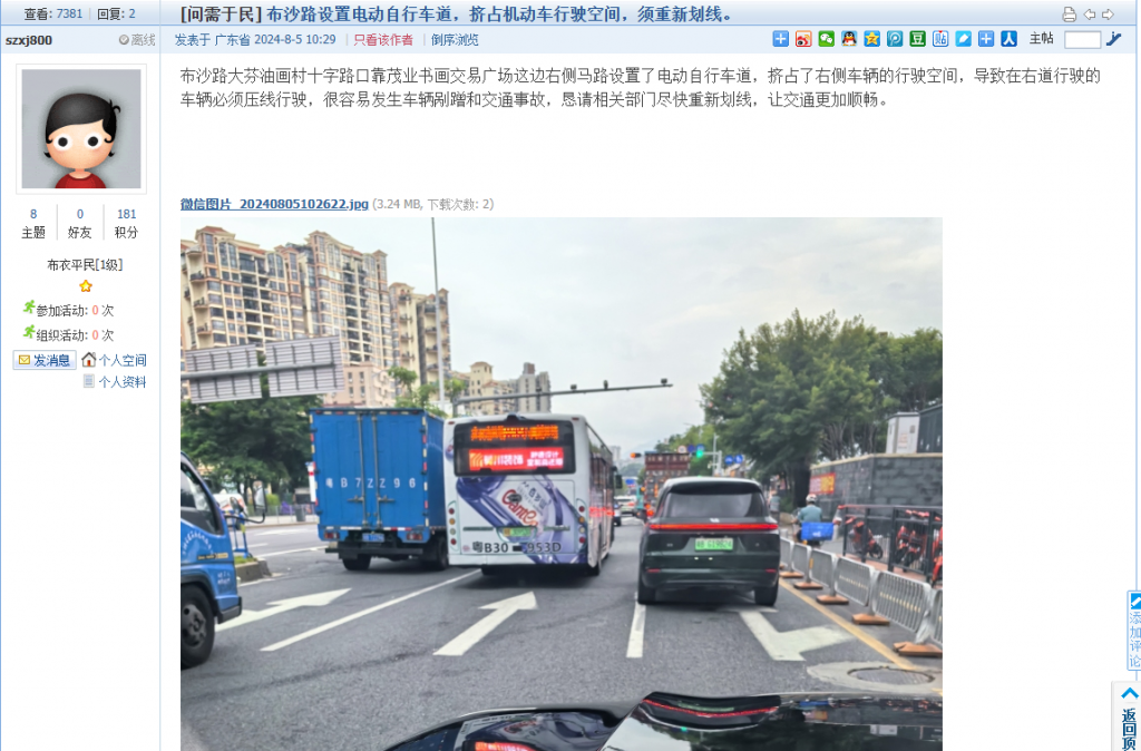 2、帖文《布沙路设置电动自行车道,挤占机动车行驶空间,须重新划线。》