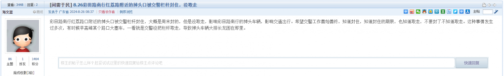 16. 帖文《8.26彩田路南行红荔路附近的掉头口被交警栏杆封住,没取走》