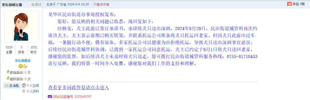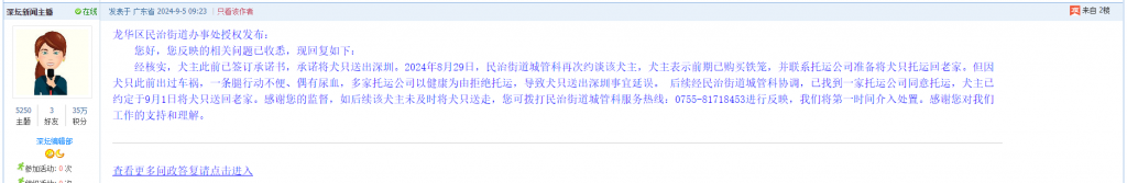 您好,您反映的相关问题已收悉,现回复如下:经核实,犬主此前已签订承诺书,承诺将犬只送出深圳。2024年8月29日,民治街道城管科再次约谈该犬主,犬主表示前期已购买铁笼,并联系托运公司准备将犬只托运回老家。但因犬只此前出过车祸,一条腿行动不便、偶有尿血,多家托运公司以健康为由拒绝托运,导致犬只送出深圳事宜延误。 后续经民治街道城管科协调,已找到一家托运公司同意托运,犬主已约定于9月1日将犬只送回老家。感谢您的监督,如后续该犬主未及时将犬只送走,您可拨打民治街道城管科服务热线:0755-81718453进行反映,我们将第一时间介入处置。感谢您对我们工作的支持和理解。