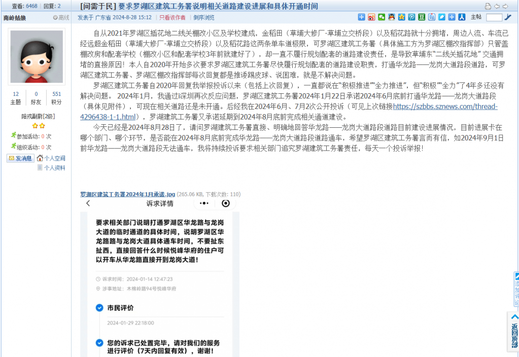 5. 帖文《要求罗湖区建筑工务署说明相关道路建设进展和具体开通时间》