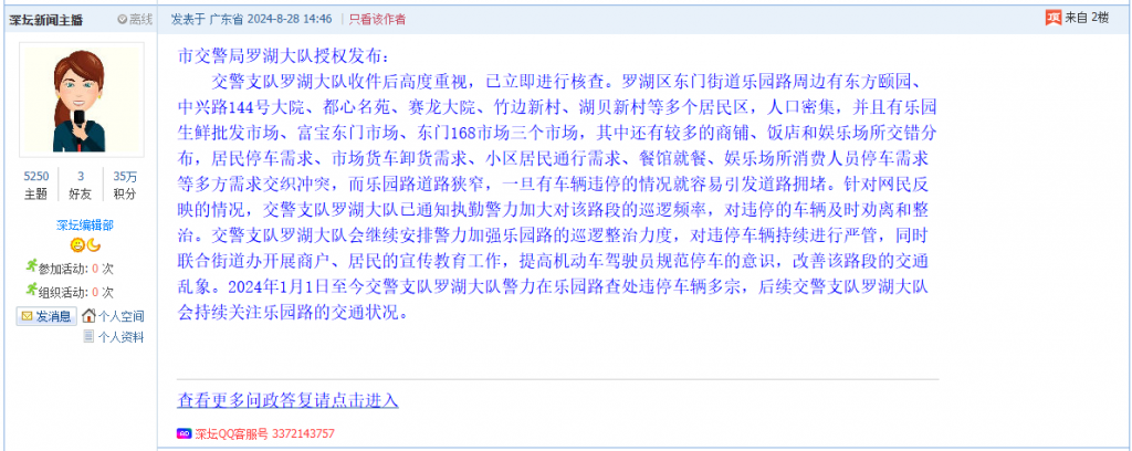 据统计,2024年8月26日-9月1日,网友在深圳论坛发布问政类帖文共26篇,得到相关单位正式回应的帖文数为21篇,罗湖区城市管理和综合执法局、市交警局龙岗大队、罗湖区莲塘街道办事处、罗湖区翠竹街道办事处回应最及时。