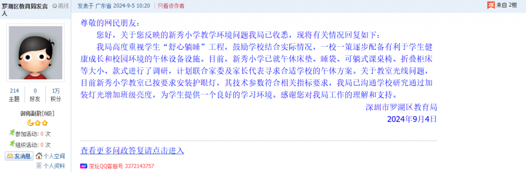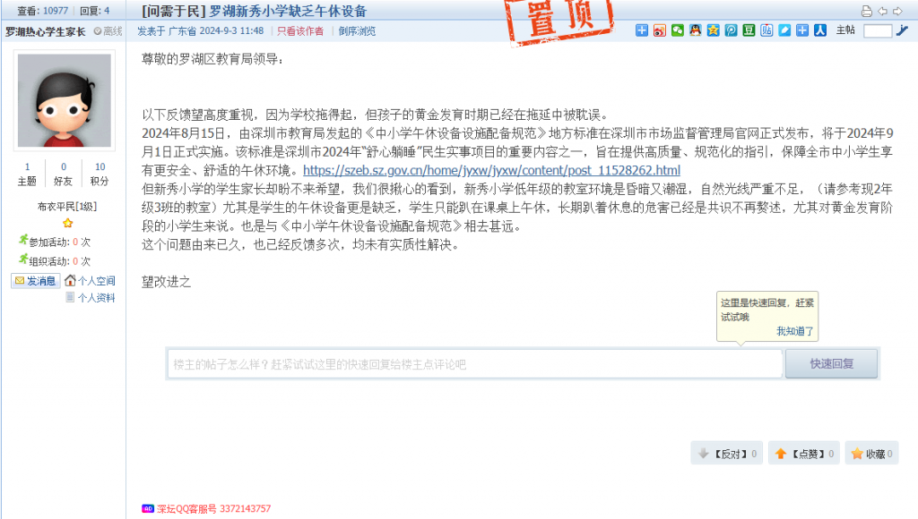 13. 帖文《罗湖新秀小学缺乏午休设备》