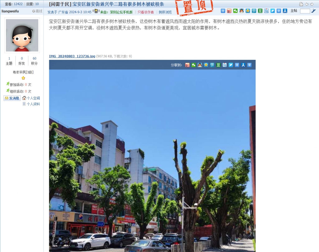 12. 帖文《宝安区新安街道兴华二路有很多树木被砍枝条》
