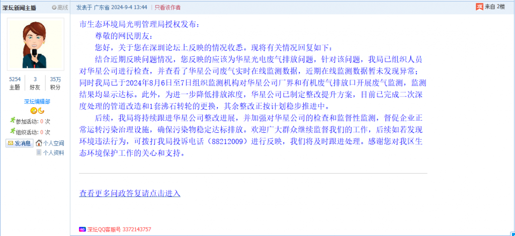 后续,我局将持续跟进华星公司整改进展,并加强对华星公司的检查和监督性监测,督促企业正常运转污染治理设施,确保污染物稳定达标排放。欢迎广大群众继续监督我们的工作,后续如若发现环境违法行为,可拨打我局投诉电话(88212009)进行反映,我们将及时跟进处理。感谢您对我区生态环境保护工作的关心和支持。