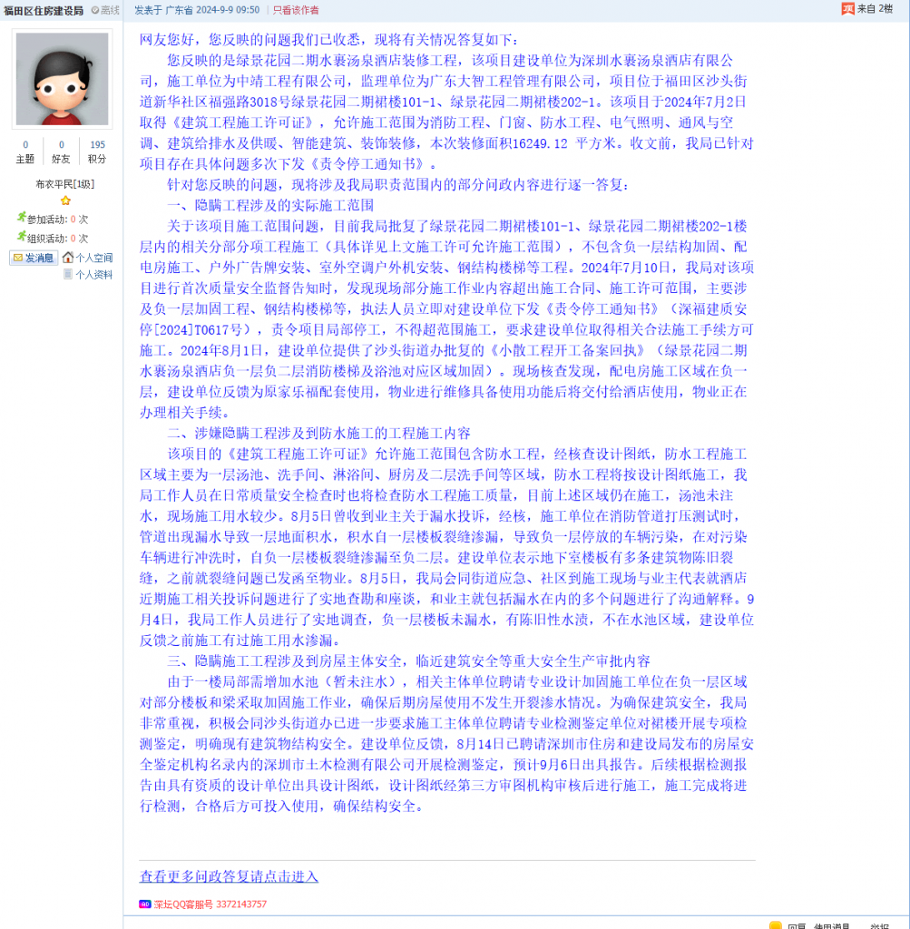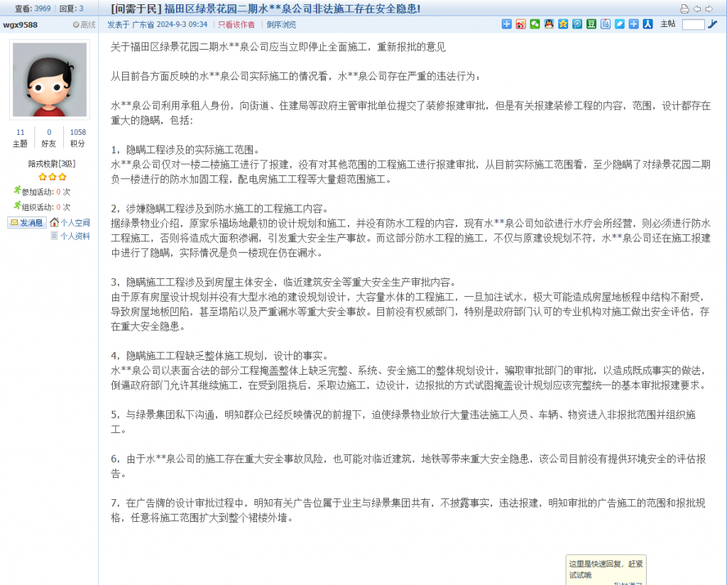 9. 帖文《福田区绿景花园二期水**泉公司非法施工存在安全隐患!》