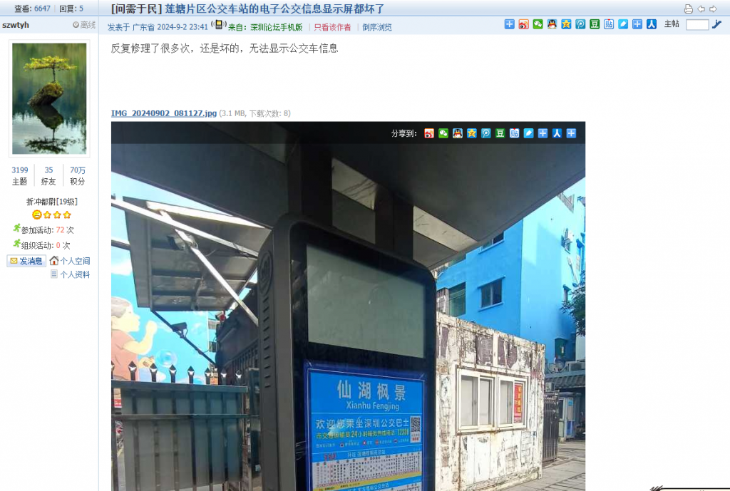 7. 帖文《莲塘片区公交车站的电子公交信息显示屏都坏了》
