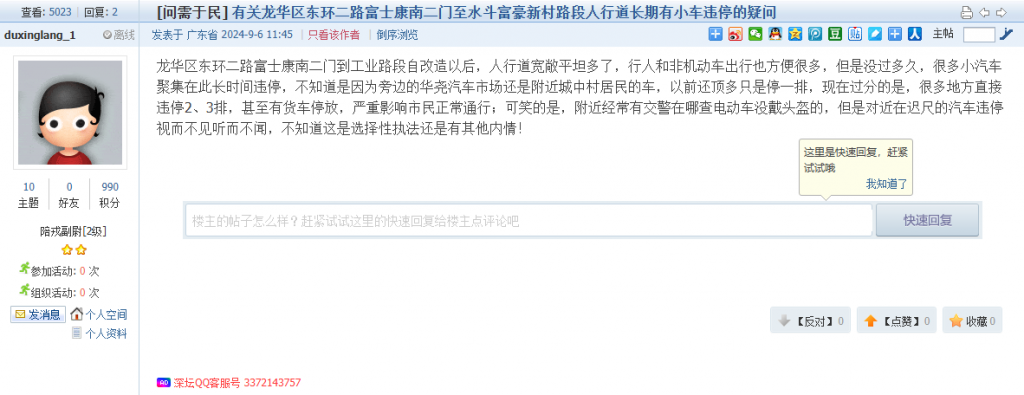 20. 帖文《有关龙华区东环二路富士康南二门至水斗富豪新村路段人行道长期有小车违停的疑问》