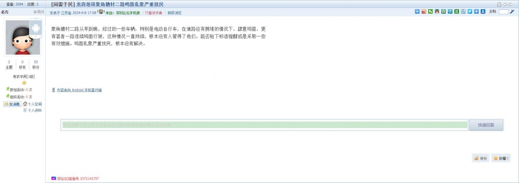 29. 帖文《龙岗坂田象角塘村二路鸣笛乱象严重扰民》