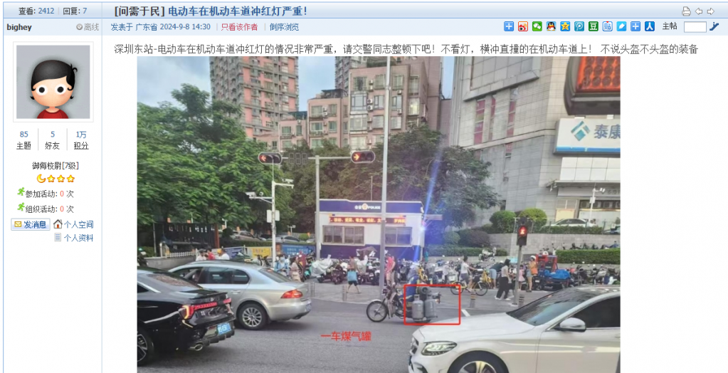 21. 帖文《电动车在机动车道冲红灯严重!》