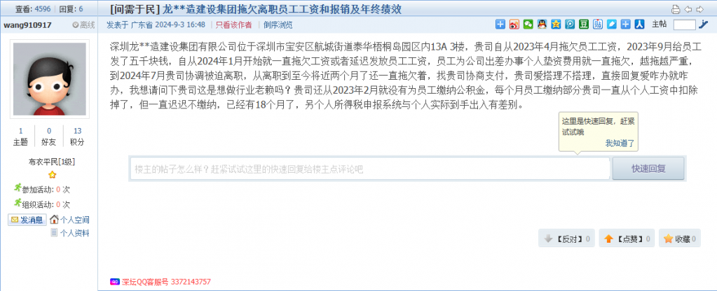 14. 帖文《龙**造建设集团拖欠离职员工工资和报销及年终绩效》