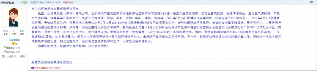 经查,沙彼高仪器(深圳)有限公司,位于深圳市宝安区新桥街道新桥社区新桥洋下三路2号A栋一层至六层及BCDE栋。该司主营灭蚊器、厨房清洁用品、室内空气清新器、车载空气清新器、消毒器等产品的生产;主要工艺为插件、焊接、装配、注塑、混配、罐装、包装等。2021年1月24日取得环评备案回执(深环宝备[2021]088号),2021年4月9日获得营业执照,于该址正式生产。我局执法人员于2024年9月10日15时10分前往现场检查时该公司车间正常生产,废气处理设施正常运行,检查时有少量香精香味,无臭气产生。主要涉噪声设备为楼顶的空调冷却塔、风机等,现场检查时无明显异常噪声。我局执法人员曾于8月14日20时会同深圳市生态环境监测站宝安分站的监测人员在该公司厂界和厂门口对面小区(芙景豪庭)顶层一住宅(正对企业的次卧)进行噪声监测,根据监测报告(报告编号:BAXZJ202400042)显示结果达标。同时,根据现场调查情况初判,该区域周边有外环高速、广深高速和107国道,加上车流量大,感官上以交通噪声混杂一般生活环境噪声为主,未发现明显突出的工业噪声源。下一步,我局将加强对该企业的监管巡查力度,同时进一步加大该区域的噪声管控力度,加大巡查频次,做好周边居民安抚解释工作,以有效化解舆情投诉。