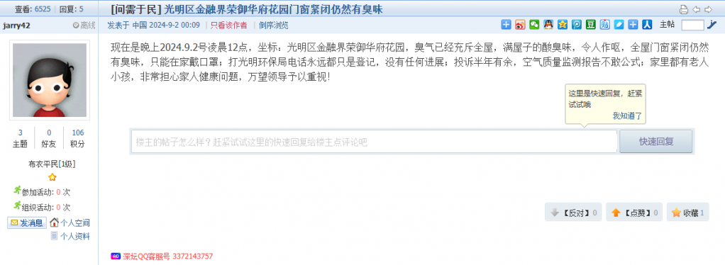 1. 帖文《光明区金融界荣御华府花园门窗紧闭仍然有臭味》