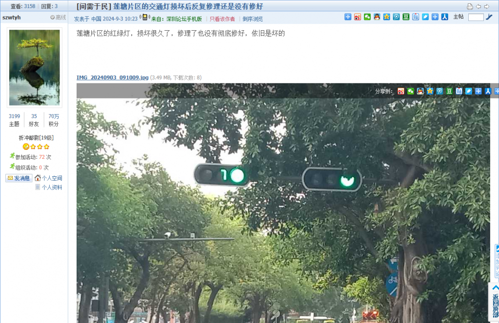 11. 帖文《莲塘片区的交通灯损坏后反复修理还是没有修好》