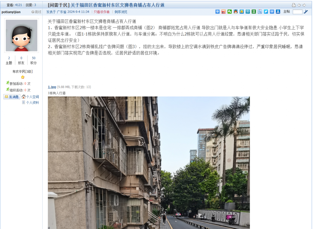 18. 帖文《关于福田区香蜜新村东区文狮巷商铺占有人行道》