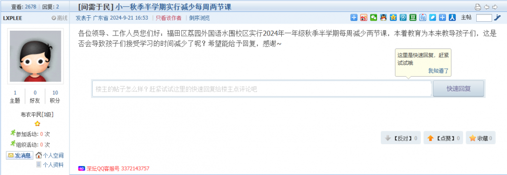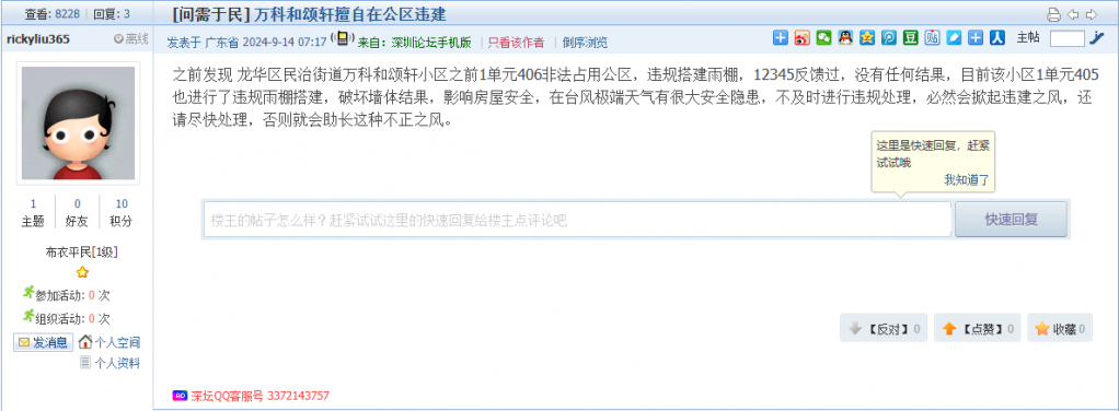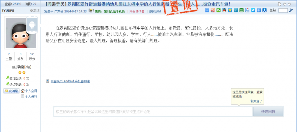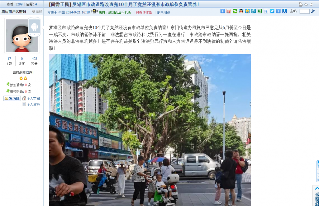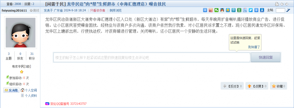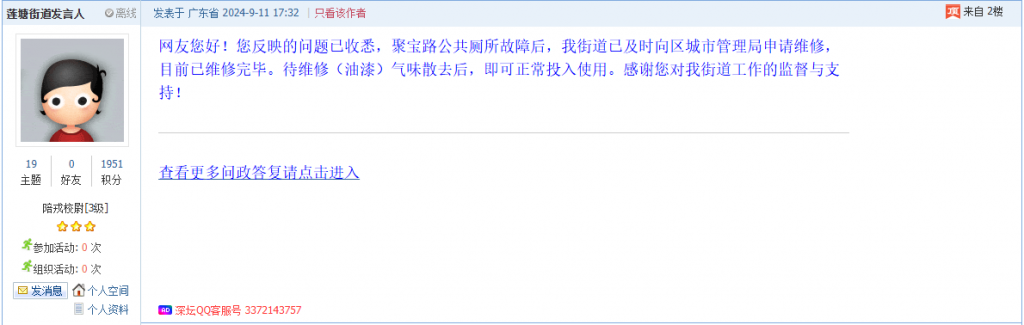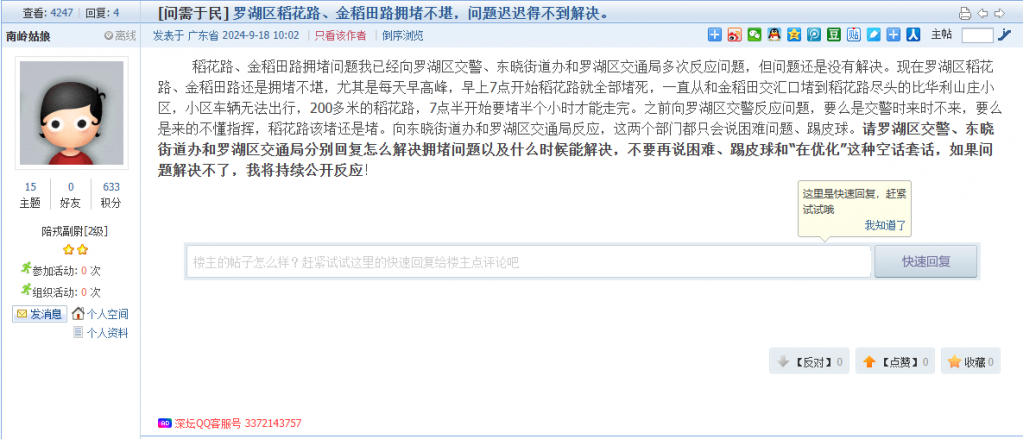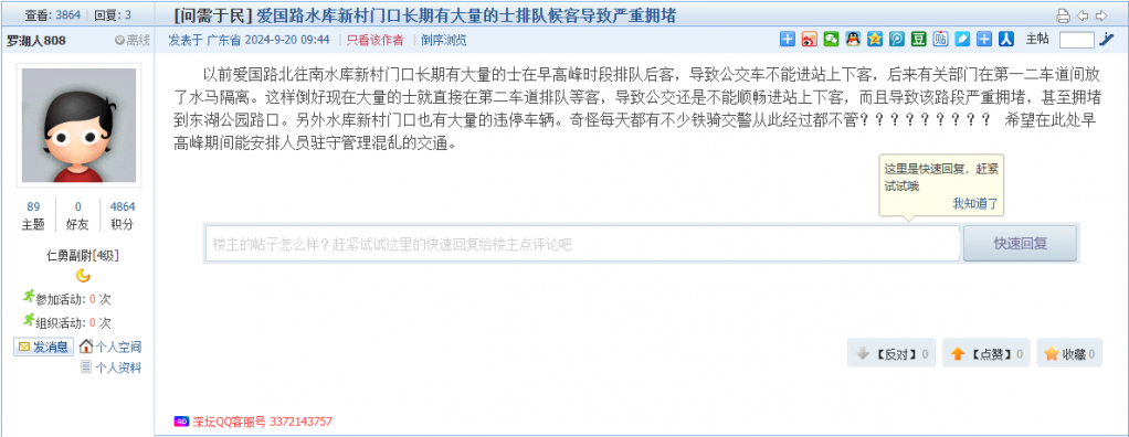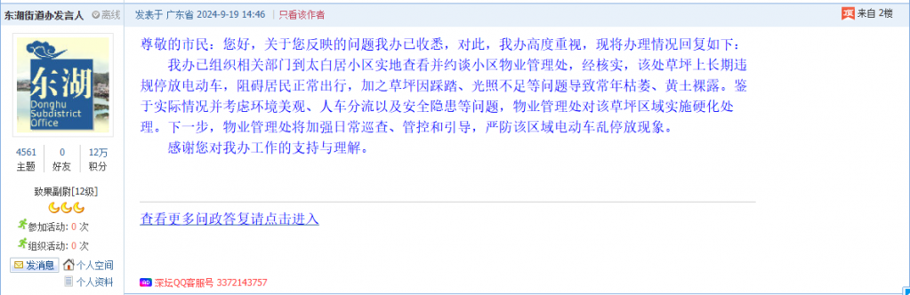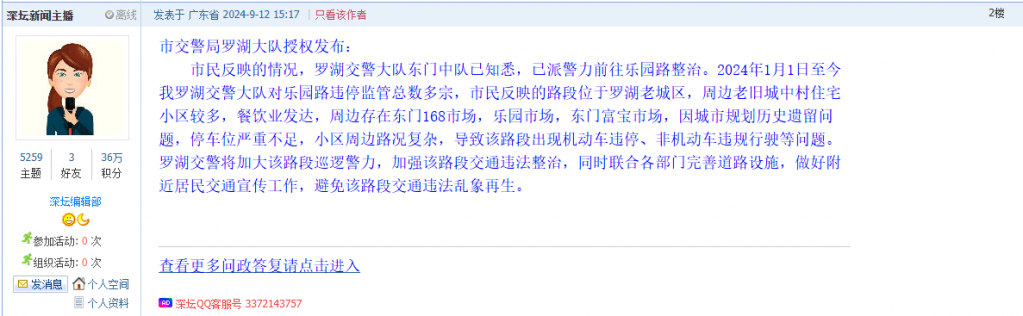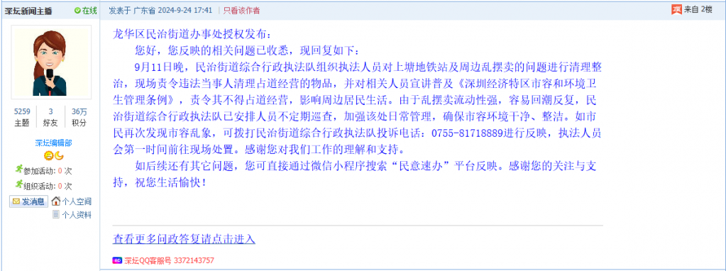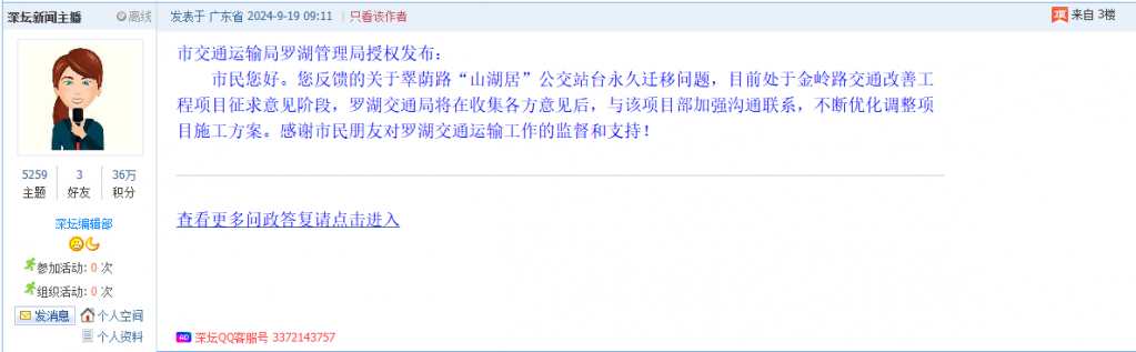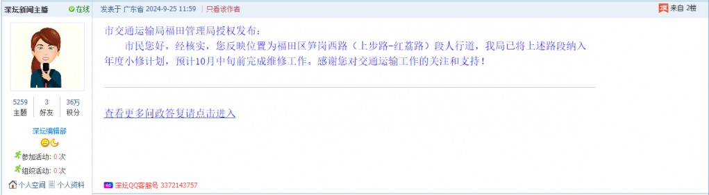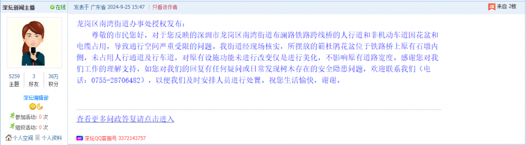 各职能单位如需对网友反映的问题进行回应,可在深圳论坛注册官方账号并通过认证,回帖进行回应。