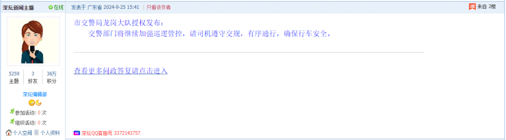 据统计,2024年9月9日-9月22日,网友在深圳论坛发布问政类帖文共78篇,得到相关单位正式回应的帖文数为58篇,市交警局罗湖大队和龙岗区布吉街道办事处回应速度最快。