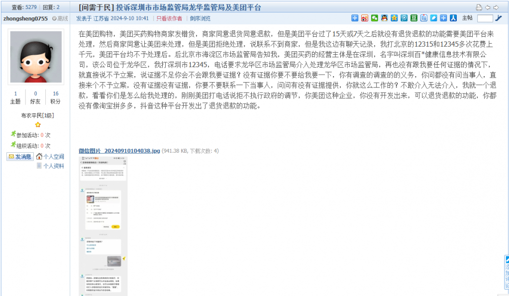 7. 帖文《投诉深圳市市场监管局龙华监管局及美团平台》