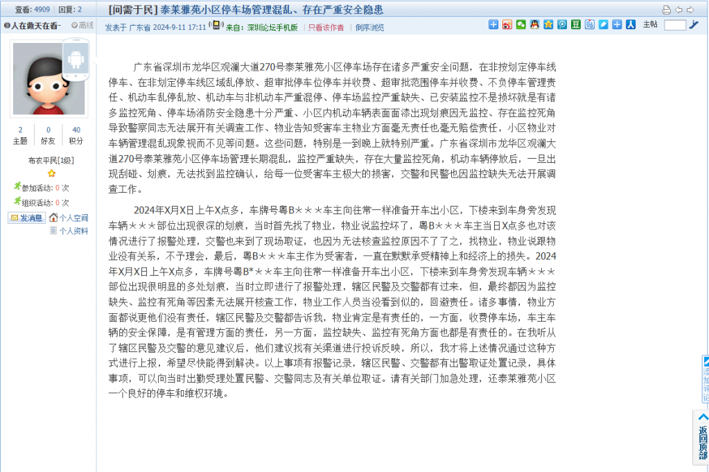 16. 帖文《泰莱雅苑小区停车场管理混乱、存在严重安全隐患》
