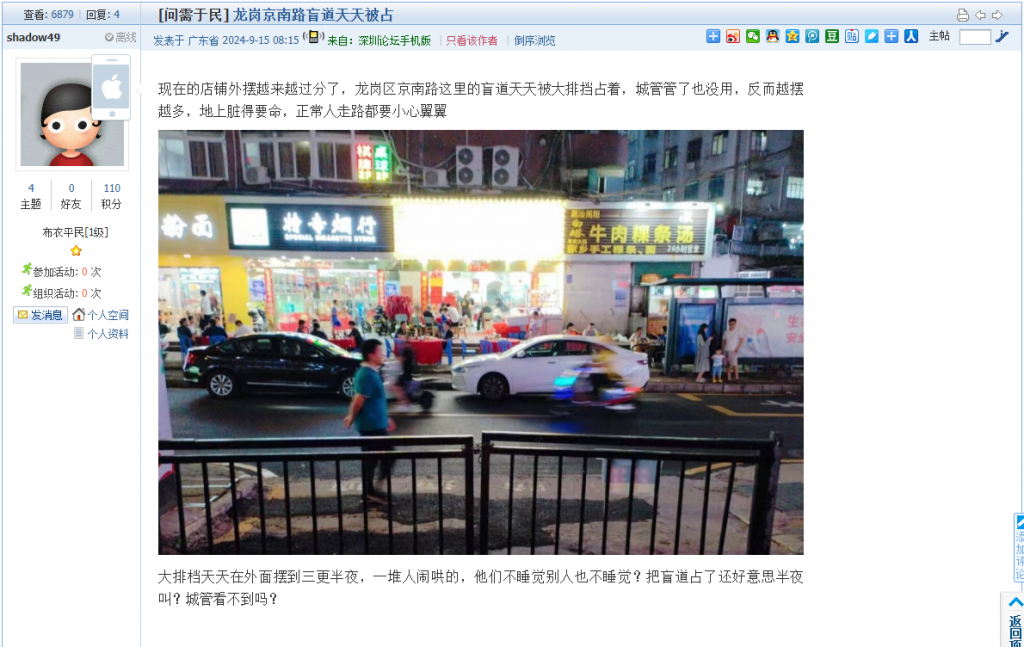 10. 帖文《龙华华宁路汽车违停 乱摆摊,无路可走》