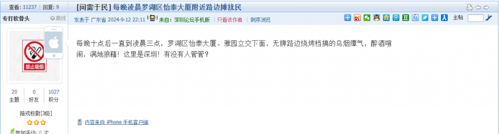 21. 帖文《每晚凌晨罗湖区怡泰大厦附近路边摊扰民》