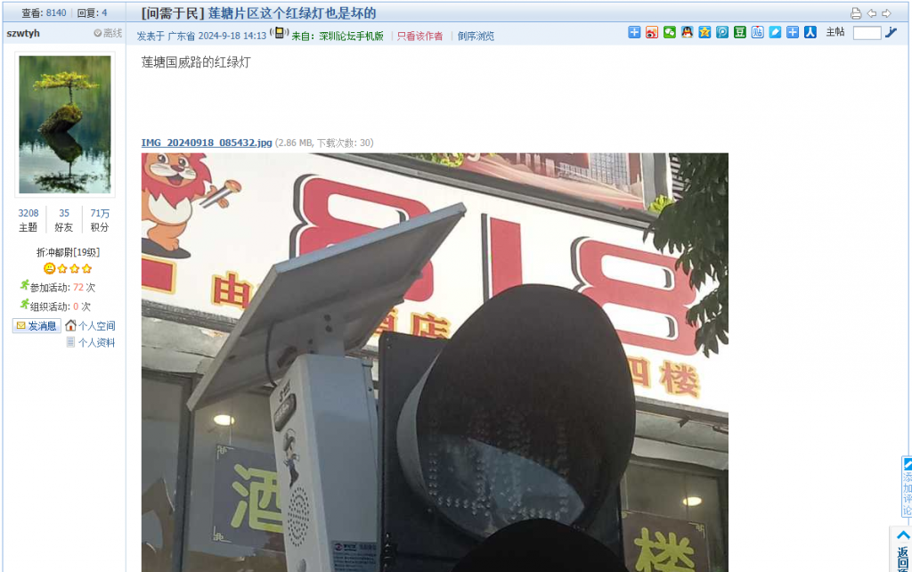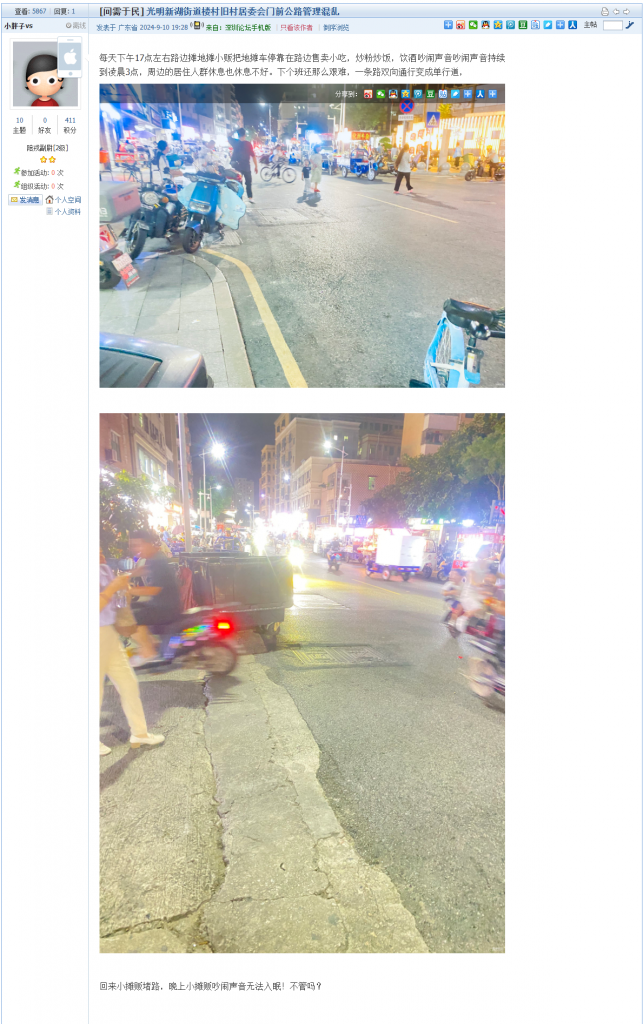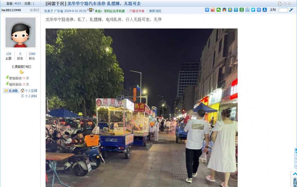 1. 帖文《龙华的早晚高峰交通秩序乱哄哄,电鸡乱停乱放》
