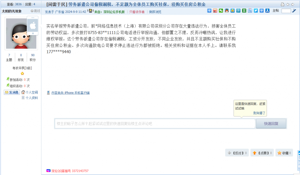 3. 帖文《劳务派遣公司偷税漏税,不足额为全体员工购买社保,没购买住房公积金》