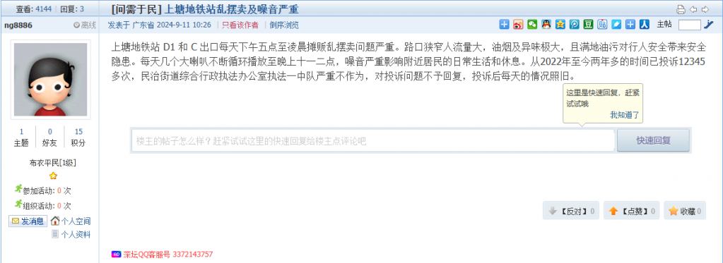 14. 帖文《上塘地铁站乱摆卖及噪音严重》
