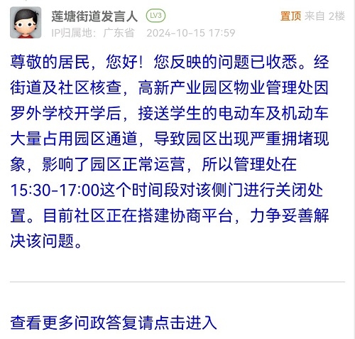尊敬的居民,您好!您反映的问题已收悉。经街道及社区核查,高新产业园区物业管理处因罗外学校开学后,接送学生的电动车及机动车大量占用园区通道,导致园区出现严重拥堵现象,影响了园区正常运营,所以管理处在15:30-17:00这个时间段对该侧门进行关闭处置。目前社区正在搭建协商平台,力争妥善解决该问题。