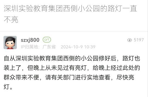 5. 帖文《深圳实验教育集团西侧小公园的路灯一直不亮》