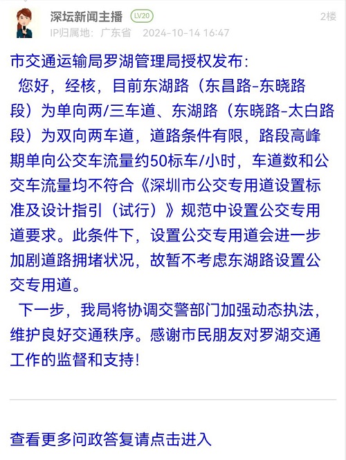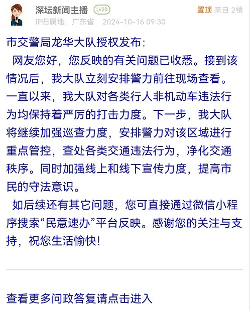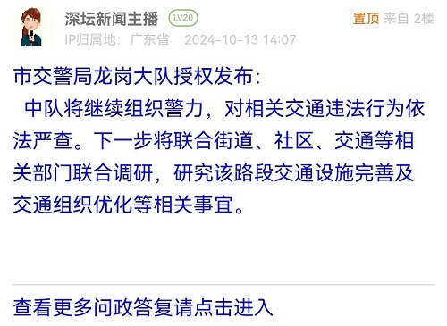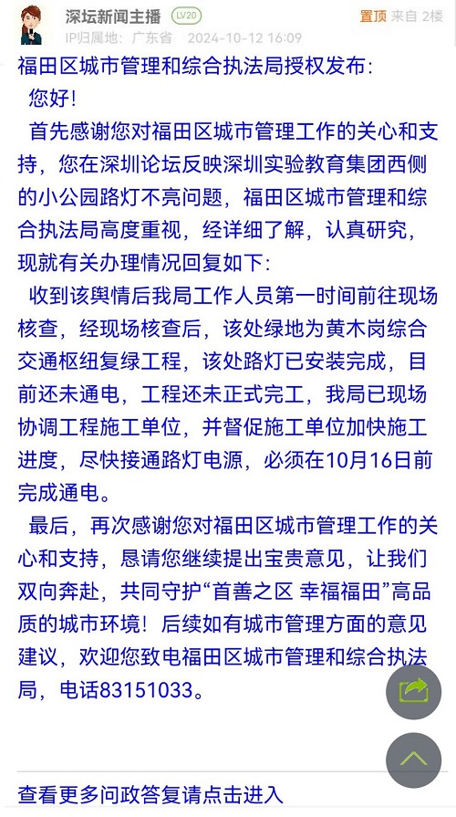 各职能单位如需对网友反映的问题进行回应,可在深圳论坛注册官方账号并通过认证,回帖进行回应。