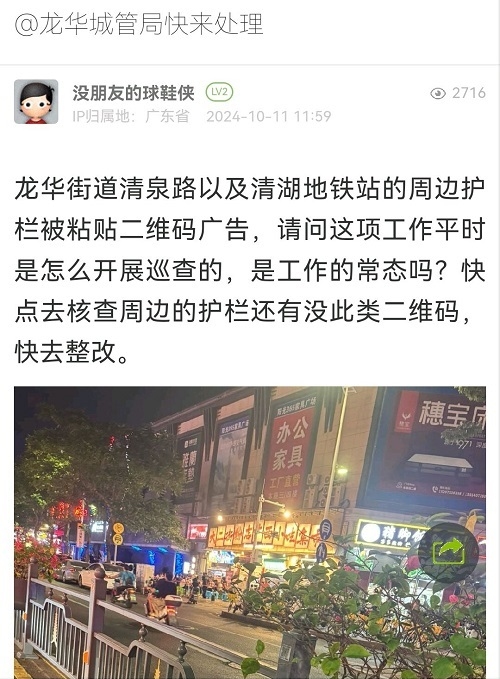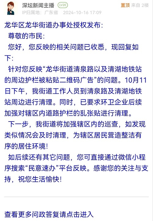 尊敬的市民:您好,您反映的相关问题已收悉,现回复如下:针对您反映“龙华街道清泉路以及清湖地铁站的周边护栏被粘贴二维码广告”的问题。10月11日下午,我街道工作人员到清泉路及清湖地铁站周边进行清理。同时,已要求环卫企业后续加强对辖区内道路护栏的乱张贴进行清理。下一步,我街道将加强辖区内的巡查,如发现类似情况会及时清理,为辖区居民营造整洁有序的居住环境!如后续还有其它问题,您可直接通过微信小程序搜索“民意速办”平台反映。感谢您的关注与支持,祝您生活愉快!