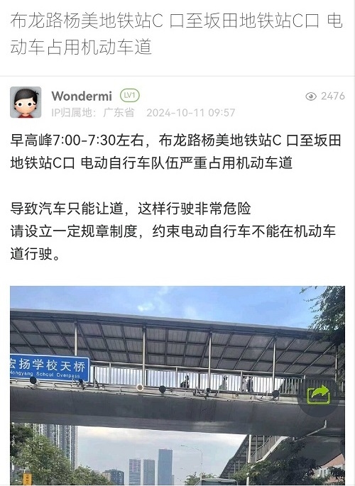 13. 帖文《布龙路杨美地铁站C 口至坂田地铁站C口 电动车占用机动车道》