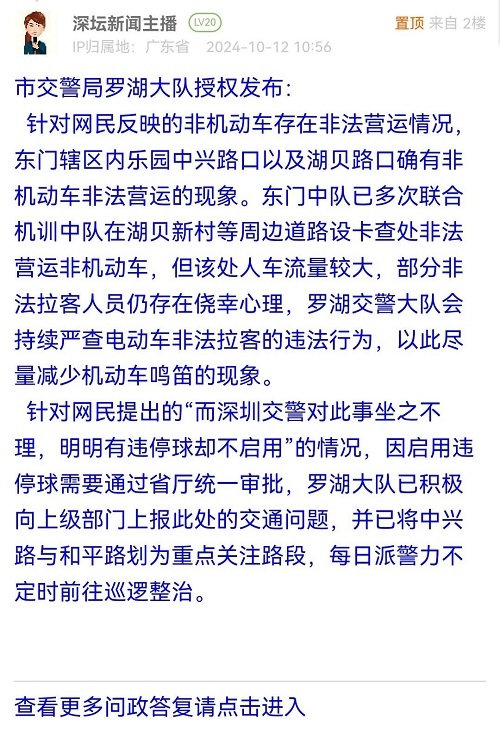 针对网民反映的非机动车存在非法营运情况,东门辖区内乐园中兴路口以及湖贝路口确有非机动车非法营运的现象。东门中队已多次联合机训中队在湖贝新村等周边道路设卡查处非法营运非机动车,但该处人车流量较大,部分非法拉客人员仍存在侥幸心理,罗湖交警大队会持续严查电动车非法拉客的违法行为,以此尽量减少机动车鸣笛的现象。针对网民提出的“而深圳交警对此事坐之不理,明明有违停球却不启用”的情况,因启用违停球需要通过省厅统一审批,罗湖大队已积极向上级部门上报此处的交通问题,并已将中兴路与和平路划为重点关注路段,每日派警力不定时前往巡逻整治。