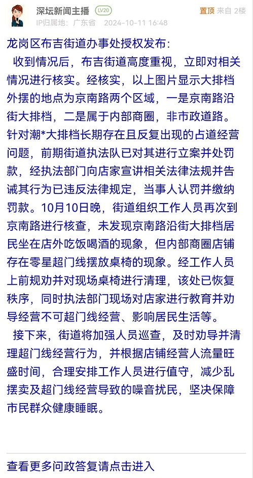 收到情况后,布吉街道高度重视,立即对相关情况进行核实。经核实,以上图片显示大排档外摆的地点为京南路两个区域,一是京南路沿街大排档,二是属于内部商圈,非市政道路。针对潮*大排档长期存在且反复出现的占道经营问题,前期街道执法队已对其进行立案并处罚款,经执法部门向店家宣讲相关法律法规并告诫其行为已违反法律规定,当事人认罚并缴纳罚款。10月10日晚,街道组织工作人员再次到京南路进行核查,未发现京南路沿街大排档居民坐在店外吃饭喝酒的现象,但内部商圈店铺存在零星超门线摆放桌椅的现象。经工作人员上前规劝并对现场桌椅进行清理,该处已恢复秩序,同时执法部门现场对店家进行教育并劝导经营不可超门线经营、影响居民生活等。接下来,街道将加强人员巡查,及时劝导并清理超门线经营行为,并根据店铺经营人流量旺盛时间,合理安排工作人员进行值守,减少乱摆卖及超门线经营导致的噪音扰民,坚决保障市民群众健康睡眠。