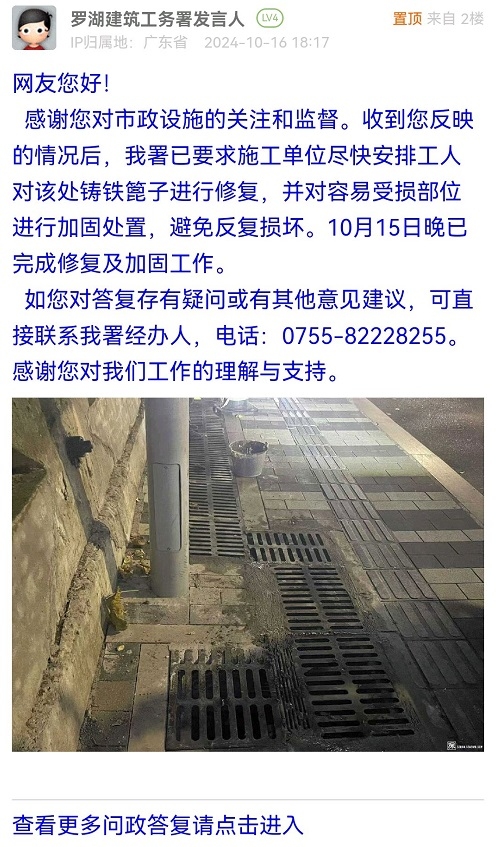 网友您好!感谢您对市政设施的关注和监督。收到您反映的情况后,我署已要求施工单位尽快安排工人对该处铸铁篦子进行修复,并对容易受损部位进行加固处置,避免反复损坏。10月15日晚已完成修复及加固工作。如您对答复存有疑问或有其他意见建议,可直接联系我署经办人,电话:0755-82228255。感谢您对我们工作的理解与支持。
