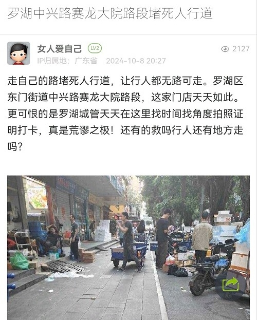 3. 帖文《罗湖中兴路赛龙大院路段堵死人行道》