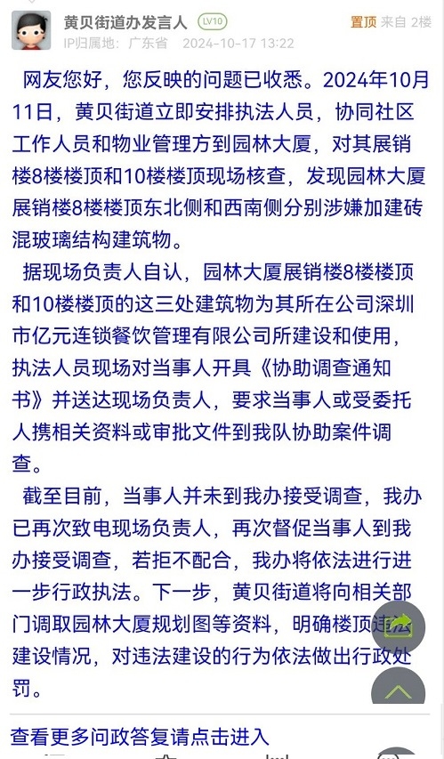 网友您好,您反映的问题已收悉。2024年10月11日,黄贝街道立即安排执法人员,协同社区工作人员和物业管理方到园林大厦,对其展销楼8楼楼顶和10楼楼顶现场核查,发现园林大厦展销楼8楼楼顶东北侧和西南侧分别涉嫌加建砖混玻璃结构建筑物。据现场负责人自认,园林大厦展销楼8楼楼顶和10楼楼顶的这三处建筑物为其所在公司深圳市亿元连锁餐饮管理有限公司所建设和使用,执法人员现场对当事人开具《协助调查通知书》并送达现场负责人,要求当事人或受委托人携相关资料或审批文件到我队协助案件调查。截至目前,当事人并未到我办接受调查,我办已再次致电现场负责人,再次督促当事人到我办接受调查,若拒不配合,我办将依法进行进一步行政执法。下一步,黄贝街道将向相关部门调取园林大厦规划图等资料,明确楼顶违法建设情况,对违法建设的行为依法做出行政处罚。