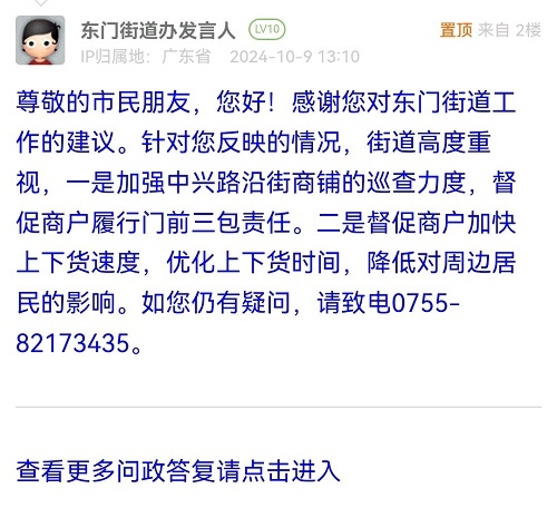 尊敬的市民朋友,您好!感谢您对东门街道工作的建议。针对您反映的情况,街道高度重视,一是加强中兴路沿街商铺的巡查力度,督促商户履行门前三包责任。二是督促商户加快上下货速度,优化上下货时间,降低对周边居民的影响。如您仍有疑问,请致电0755-82173435。