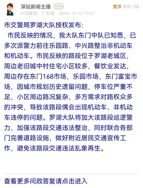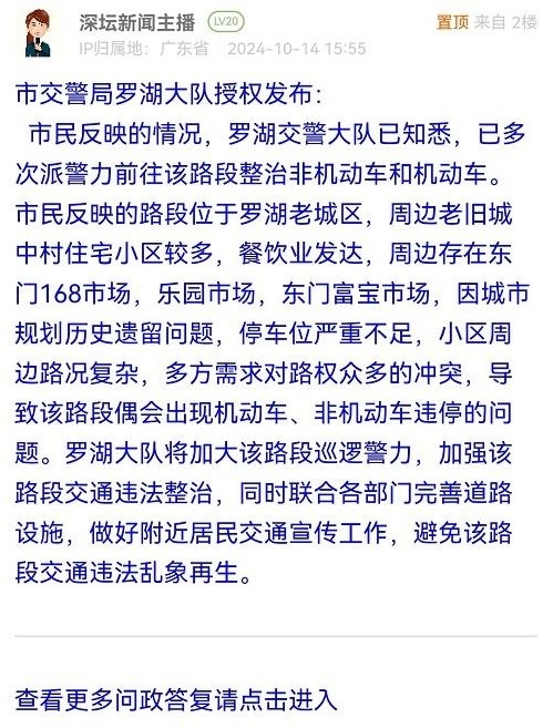市民反映的情况,罗湖交警大队已知悉,已多次派警力前往该路段整治非机动车和机动车。市民反映的路段位于罗湖老城区,周边老旧城中村住宅小区较多,餐饮业发达,周边存在东门168市场,乐园市场,东门富宝市场,因城市规划历史遗留问题,停车位严重不足,小区周边路况复杂,多方需求对路权众多的冲突,导致该路段偶会出现机动车、非机动车违停的问题。罗湖大队将加大该路段巡逻警力,加强该路段交通违法整治,同时联合各部门完善道路设施,做好附近居民交通宣传工作,避免该路段交通违法乱象再生。