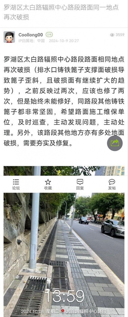 19. 帖文《罗湖区太白路辐照中心路段路面同一地点再次破损》