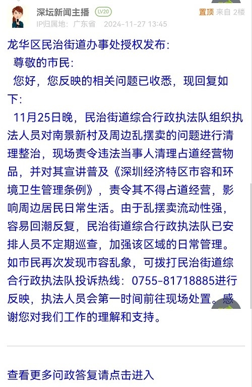 尊敬的市民:您好,您反映的相关问题已收悉,现回复如下:11月25日晚,民治街道综合行政执法队组织执法人员对南景新村及周边乱摆卖的问题进行清理整治,现场责令违法当事人清理占道经营物品,并对其宣讲普及《深圳经济特区市容和环境卫生管理条例》,责令其不得占道经营,影响周边居民日常生活。由于乱摆卖流动性强,容易回潮反复,民治街道综合行政执法队已安排人员不定期巡查,加强该区域的日常管理。如市民再次发现市容乱象,可拨打民治街道综合行政执法队投诉热线:0755-81718885进行反映,执法人员会第一时间前往现场处置。感谢您对我们工作的理解和支持。