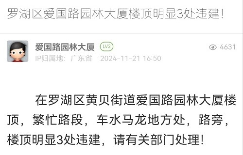 20. 帖文《罗湖区爱国路园林大厦楼顶明显3处违建!》《罗湖区爱国路园林大厦楼顶明显3处违建!(二)》