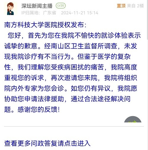 您好,首先为您在我院不愉快的就诊体验表示诚挚的歉意。经南山区卫生监督所调查,未发现我院诊疗有不当行为。但鉴于医学的复杂性,我们理解您受疾病困扰的痛苦,我院高度重视您的诉求,再次邀请您来院,我院将组织院内外专家为您会诊。如您仍有异议,我院愿协助您申请法律援助,通过合法途径解决问题。感谢您的反馈!